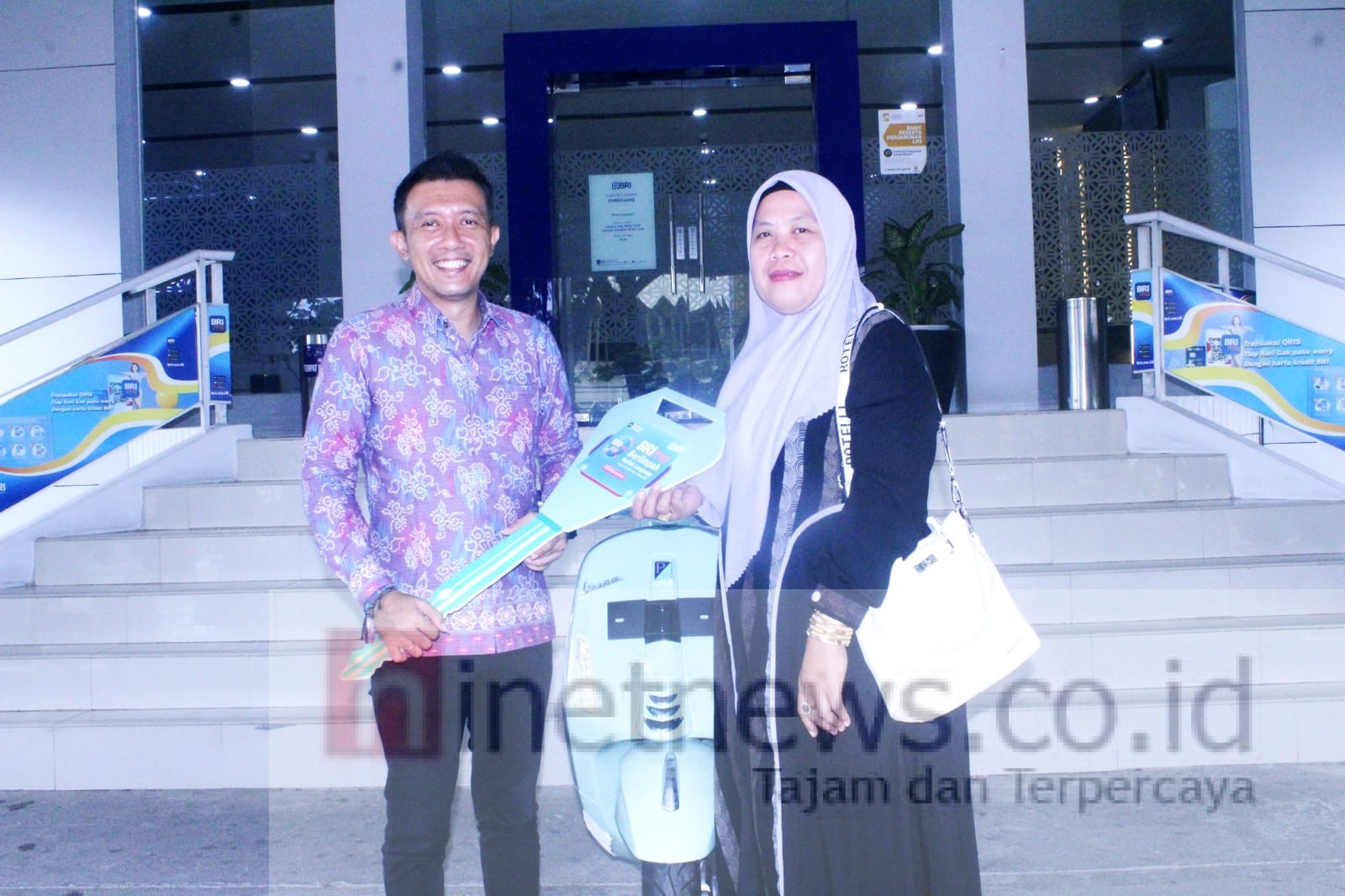 Pinca BRI cab. Enrekang Mas Bangkit Wira Perdana menyerahkan langsung dengan ramah dan memberikan kunci kontak kepada nasabah peraih hadiah scooter matic “Vespa’ di depan teras gedung BRI Cab. Enrekang dengan ucapan selamat.