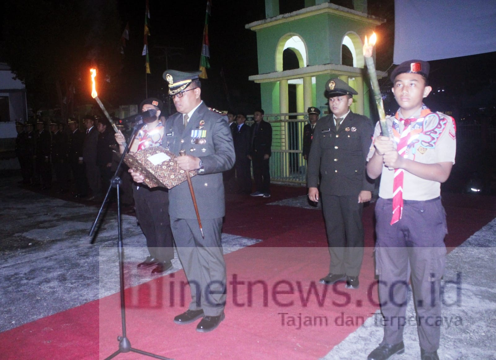 Inspektur upacara Letkol Inf.Ausgustiar Adinegoro diheningnya malam TMP  berpenerangan lilin kecil meletakkan karangan bunga di tugu perjuangan dengan dijaga 2 aparat TNI Dim 1419 dan dilanjut tabur bunga.(mas)