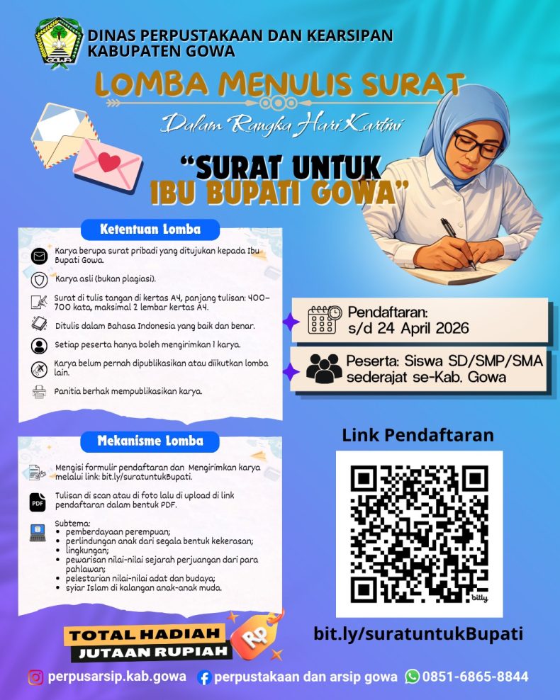 inetnews.co.id — Dalam rangka memperingati Hari Kartini Tahun 2026, Dinas Perpustakaan dan Kearsipan (Dispusip) Kabupaten Gowa menggelar Lomba Penulisan Surat dengan tema “Surat untuk Pemimpin: Meneruskan Jejak Pena Kartini untuk Gowa yang Lebih Maju.”
