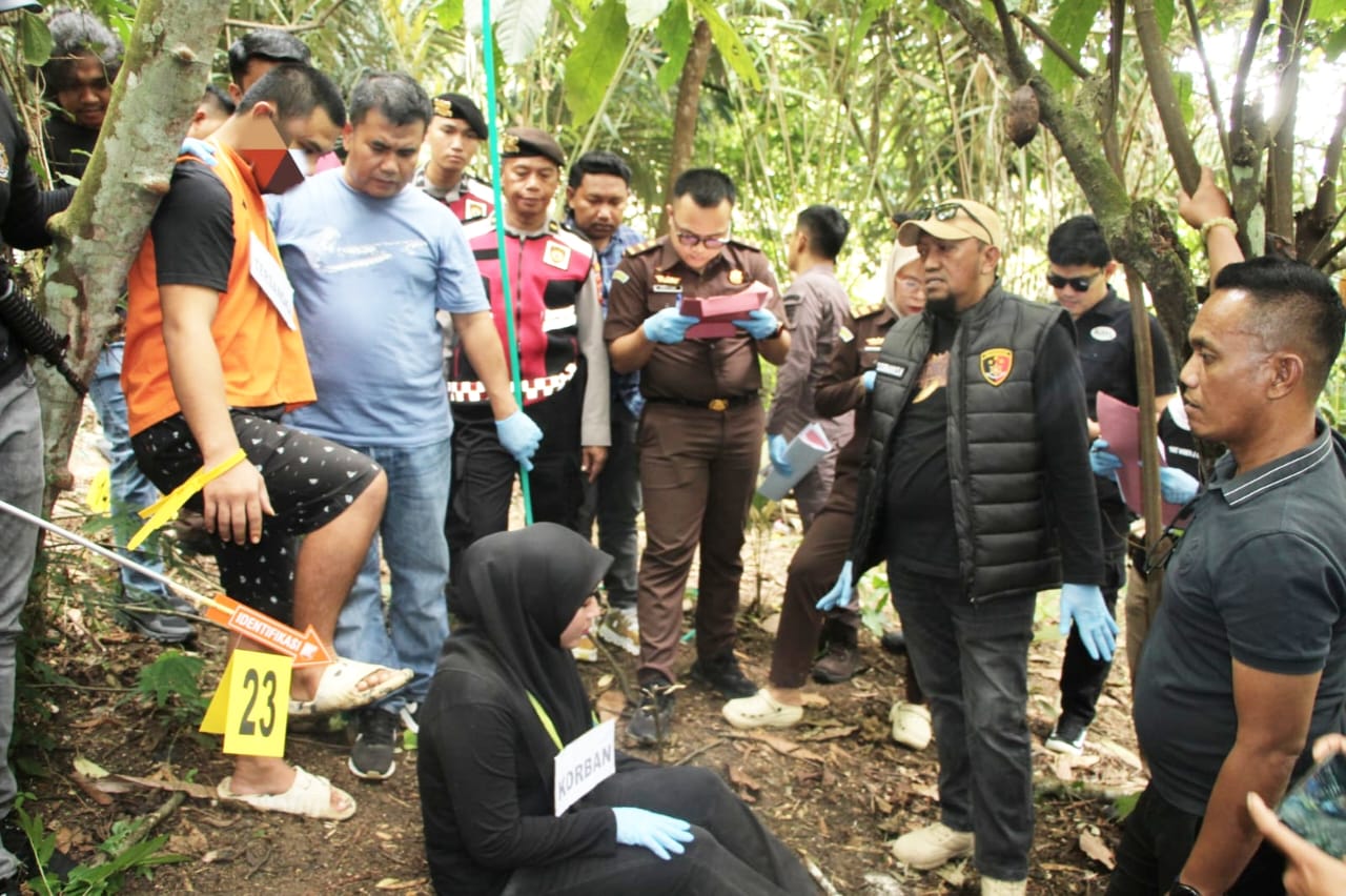 Rekonstruksi digelar sebagai bagian dari tahapan penyidikan untuk memperjelas rangkaian peristiwa serta mencocokkan keterangan tersangka dan saksi-saksi. Kasus pembunuhan di TKP area kebun salak di lereng perbukitan Dusun Lintik, korban seorang wanita berinisial SY ditemukan meregang nyawa dalam posisi tergantung.